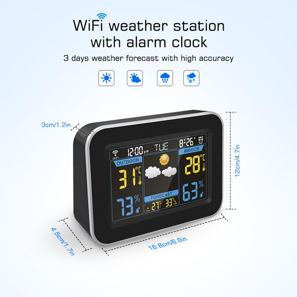 1. Time, date and week are displayed on the same screen2. Indoor and outdoor temperature and humidity data display. 3. Minimum / maximum display of daily air humidity and temperature4. Weather data is more convenient and accurate to obtain directly from the Internet.5. Weather display for the day and weather forecast for the next two days.6.12 / 24-hour mode switching7. Alarm clock function: two groups of alarm bells, independent switch setting8. The sal brightness and length are adjustable9. You can locate any city to check the local weather conditions.10. The above functions can be set through the mobile phone APP (download APPwifi CLOCK from the mobile phone), convenient and fast11. Power supply mode: power supply.Material: plasticDimensions: 16.8*12*1.7cmPackage: 1 * thermometerIndoor/outdoor temperature and humidity, air pressure and history, lunar phase, calendar, atomic clock, weather forecast and trends, temperature and humidity alerts, etc.
