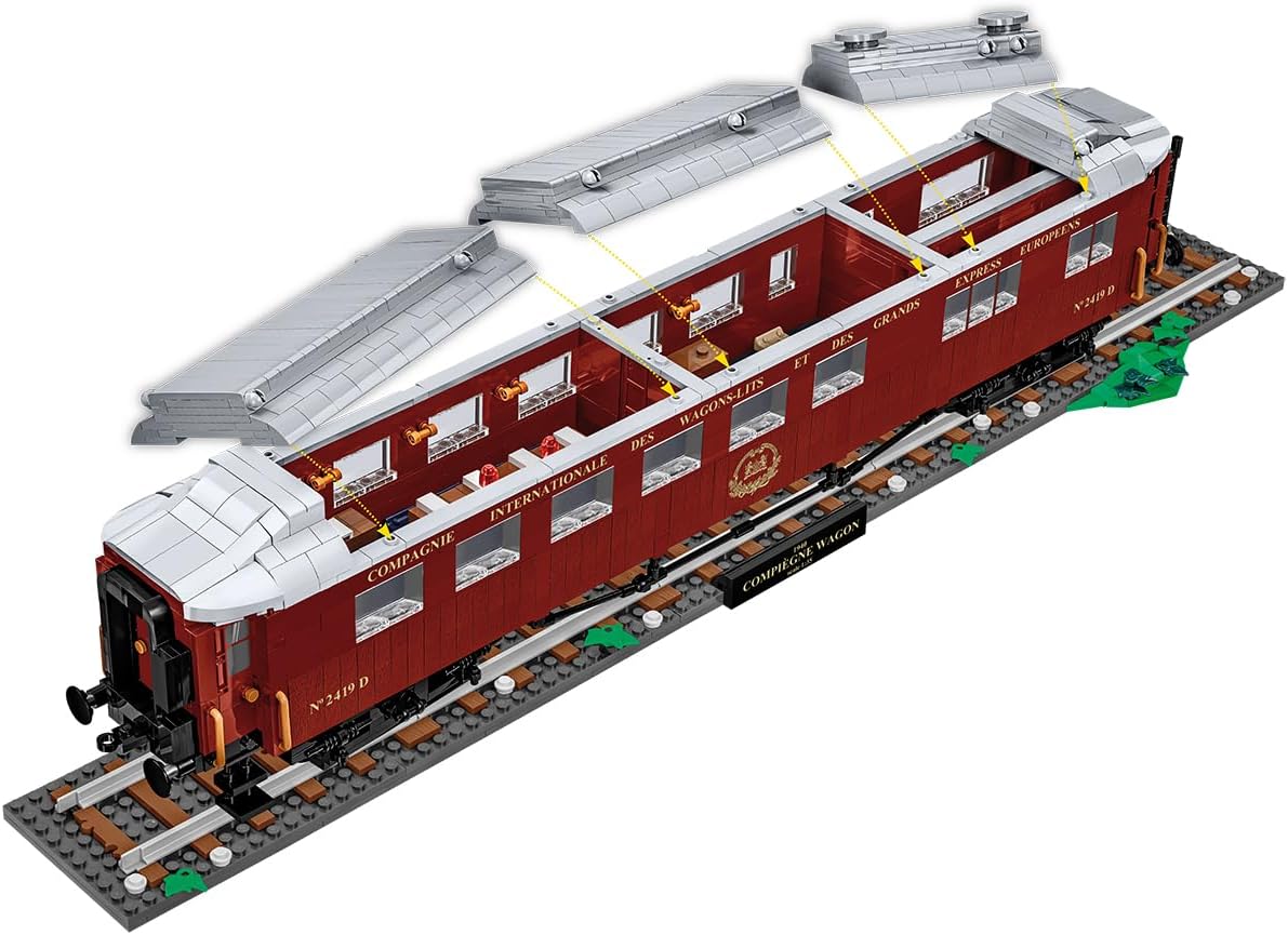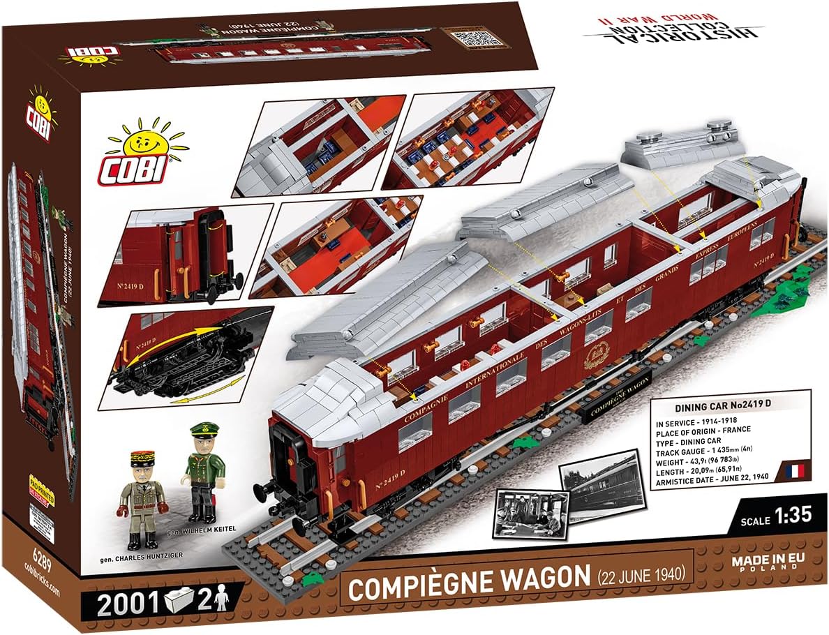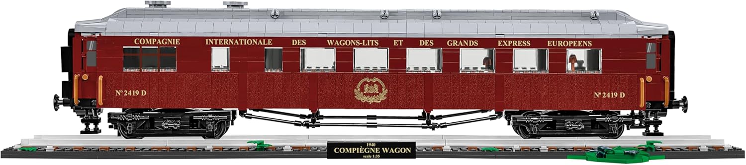 The railway collection from COBI is still growing! Another historical railway wagon in 1:35 scale is joining the series. This is the legendary restaurant wagon that was part of the famous Orient Express, well-known from the armistices in Compiègne. The wagon is one of the most important symbols of both world wars, but it is also inextricably linked to railways, luxury and design style. After the total defeat of France in the 1940 campaign, the Germans found the wagon and forced the defeated French to sign the armistice in it. This only highlights how much the roles had reversed since the first armistice of WWI. On June 22, 1940, the German-French armistice was signed, after which the wagon was transported to Berlin, as an exceptionally valuable war prize affecting German morale and a symbol of superiority over France. It was placed in front of the Berlin Cathedral as a monument to victory. The wagon, measuring almost 60 centimeters, is a completely new entry to the railway series from COBI. Behind its detailed sides there is a perfectly reproduced interior, which can be easily seen after easily detaching the roof. The aforementioned sides are covered with blocks with wood texture and prints, thanks to which the wagon looks just like the original. The gold prints show the logo of Compagnie Internationale des Wagons-Lits, the wagon number and an extensive slogan located above the windows. The wagon has opening doors on the sides, on its front walls in the passages between the wagons and inside between the subsequent sections. The wagon's interior is the same as in June 1940. The wagon has a special block base consisting of five track elements and a profiled embankment with the name of the set. In 1944, the wagon was moved to the Crawinkel area, where it was stationed in a specially built tunnel. It is suspected that it was destroyed during an Allied air raid on the city of Ohrdruf in 1944, or burned by the SS in 1945.