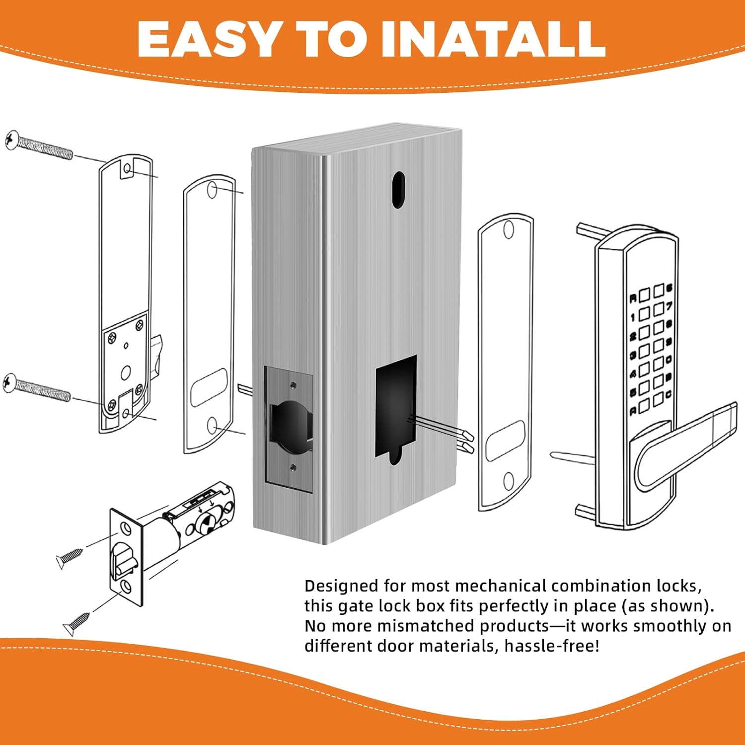 Most Popular Mechanical Lock Bundle to Save Time and Money - Get a solid steel Gate Lock Box with 2 3/8 inch (60mm) Backset at a discount with your reliable and weatherproof Lever Lock. GB2024 Steel Gate Lock Box(1 3/4"Thickness) for ANNFUZ Single/Double Keypad Mechanical Combination Lock(Anti-Oxidation Coating), fits 2-3/8" (60mm) Backset, for Metal Gates & Fence (Not Aluminum). Fits standard door thickness 35 mm to 54 mm (1 3/8” to 2 1/8”) or (1.37” to 2.12”).