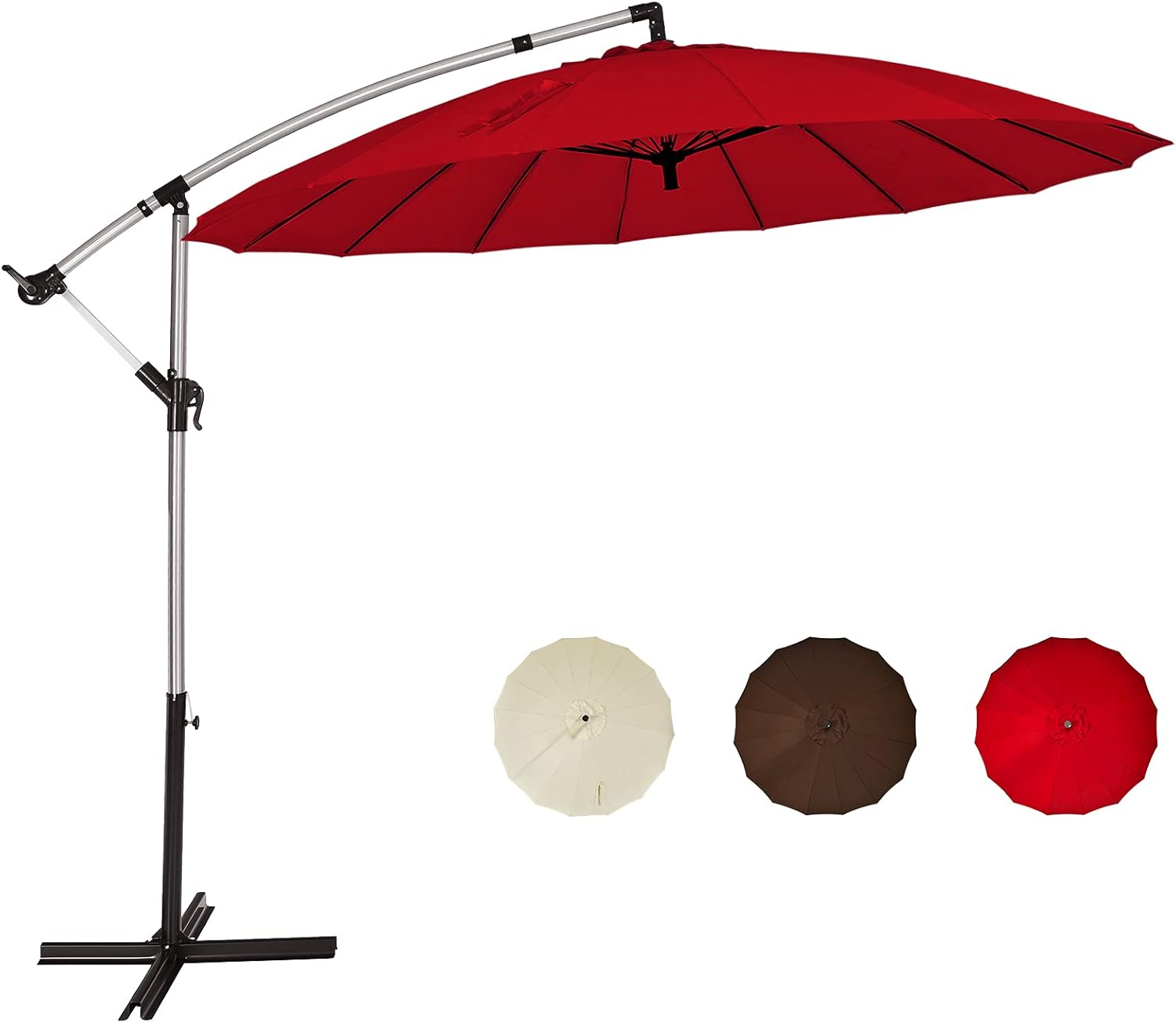 Description: Stay cool under the sunlight with this 10ft patio offset umbrella! You can enjoy outdoor leisure time with your friends and family under the 10ft handing umbrella with sun protection function. Considering your convenience, the smooth crank lift system allows you to open and close this patio offset umbrella easily. Meanwhile, the strap with hook and loop fastener will help hold the canopy while folding. And you can adjust the angle according to the changing positions of the sun by moving the handle. Made of anti-rust aluminum pole and weather-resistant polyester fabric, this cantilever umbrella with 16 sturdy ribs and cross base is durable and stable for long time use. Meanwhile, it is suitable for garden, poolside and other outdoor places. Features: Offers a large shade area with 10 feet in diameter Easy to open and close with a smooth crank lift system Adjusts the angle freely according to the sun positions 16 sturdy ribs and cross base for strong stability Waterproof and fade-resistant polyester fabric for outdoor use Avoids direct sunlight with sun protection function Provides better air circulation with wind vent on the top Suitable for garden, poolside, backyard and market, etc Specifications: Color: Beige/Red/Brown Material: Aluminum, polyester fabric, glass fiber, steel Overall dimension: 8.7 x 10 FT (L x Dia.) Length of each pole of the cross base: 35.5โ Net weight: 25 lbs Package includes: 1 x 10ft patio offset umbrella 1 x Instruction