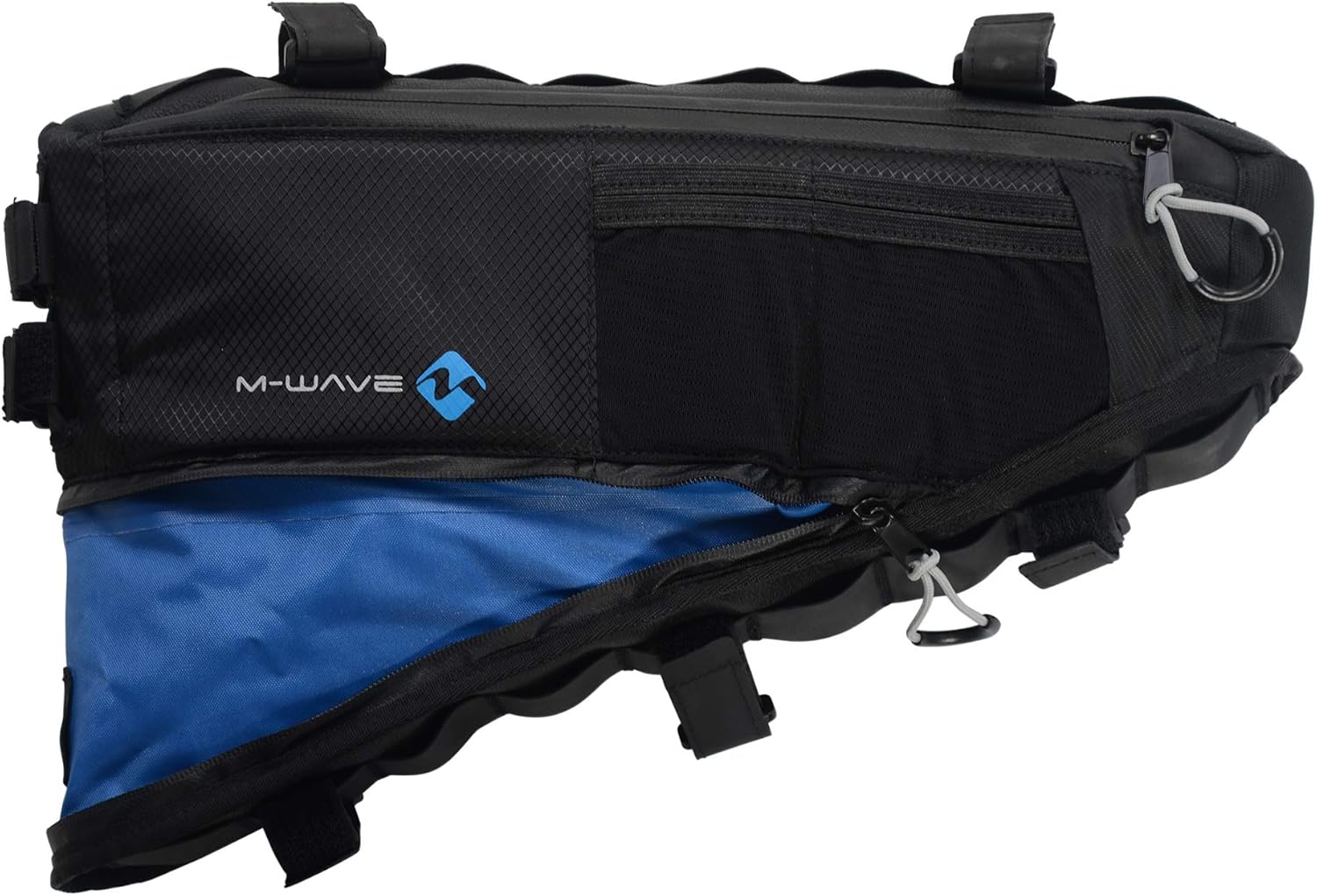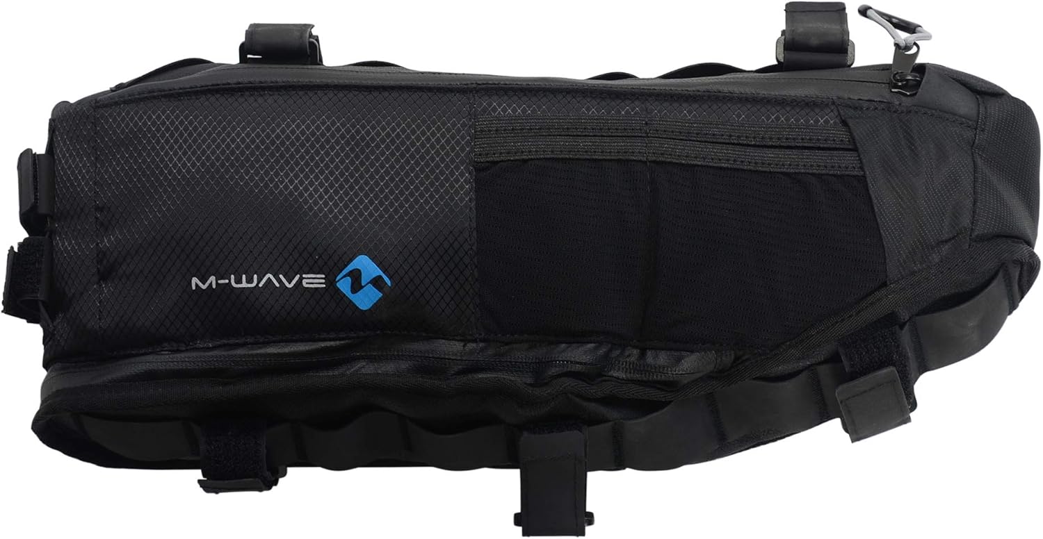 This 100% waterproof bag is expandable and made out of high tear resistant rip stop nylon. The main compartment has variable dividing options to personalize your storage system. It securely fastens to your frame with 5 universal hook and loop fasteners. There are 4 net side pockets for quick access to items stored outside of the bag.