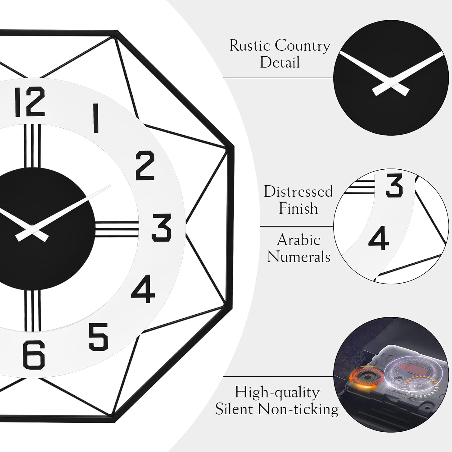Introducing the Emax Home Modern Look Wall Clock – the perfect addition to elevate your living room decor. With its large 24 inch size, geometric design, and clear numbers, this clock is both a functional timepiece and a stunning decorative piece. Made with high-quality iron and wood materials, the clock features a unique three-dimensional and double-layered design, adding a touch of sophistication to any space. Its high-temperature paint ensures that the colors stay vibrant and won't fade over time. The dial figures are clear and easy to read, making time-telling a breeze. The quartz silent movement guarantees accurate timekeeping without any ticking sounds, allowing you to enjoy a quiet environment while you sleep, study, or work. The clock operates with 1 AA carbon battery (not included), providing long-lasting performance. Hanging the clock is effortless, thanks to the hook on the back. No assembly is required, making it convenient for immediate use. Whether you're looking to upgrade your own living room decor or searching for a thoughtful gift, this Emax Home wall clock is an excellent choice. Experience the combination of style and functionality with the Emax Home Modern Look Wall Clock. Add a touch of elegance to your living space and enjoy precise timekeeping with this silent and beautiful timepiece. Order now and make a statement in your home!