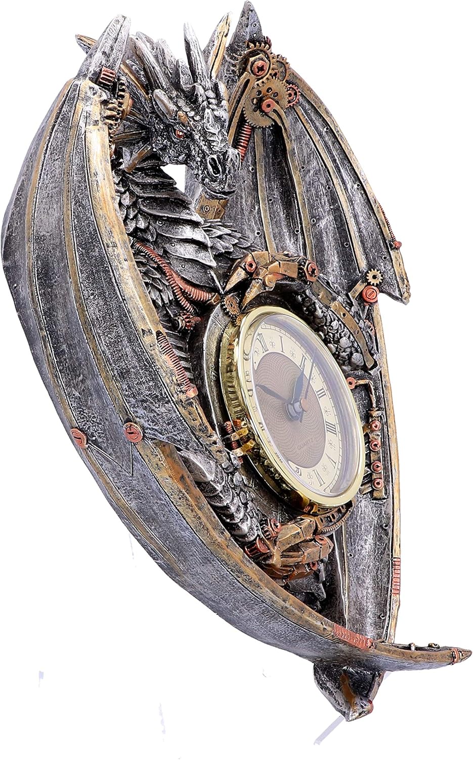 Take control of your time with this fantastic wall clock! This clock is guarded jealously by a clockwork Dragon golden cogs and brass rivets sitting on top of their metallic scales Talons curled around the clock possessively his wings are raised in a threat display Cast in high-quality resin before being painstakingly hand painted this majestic clock can adorn any wall