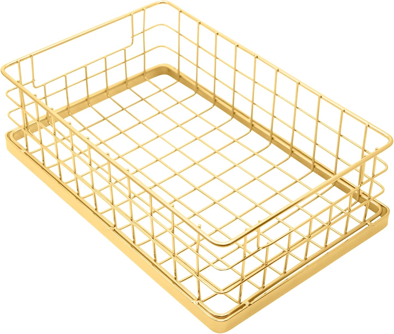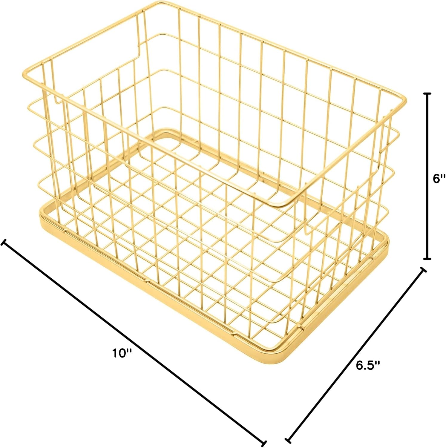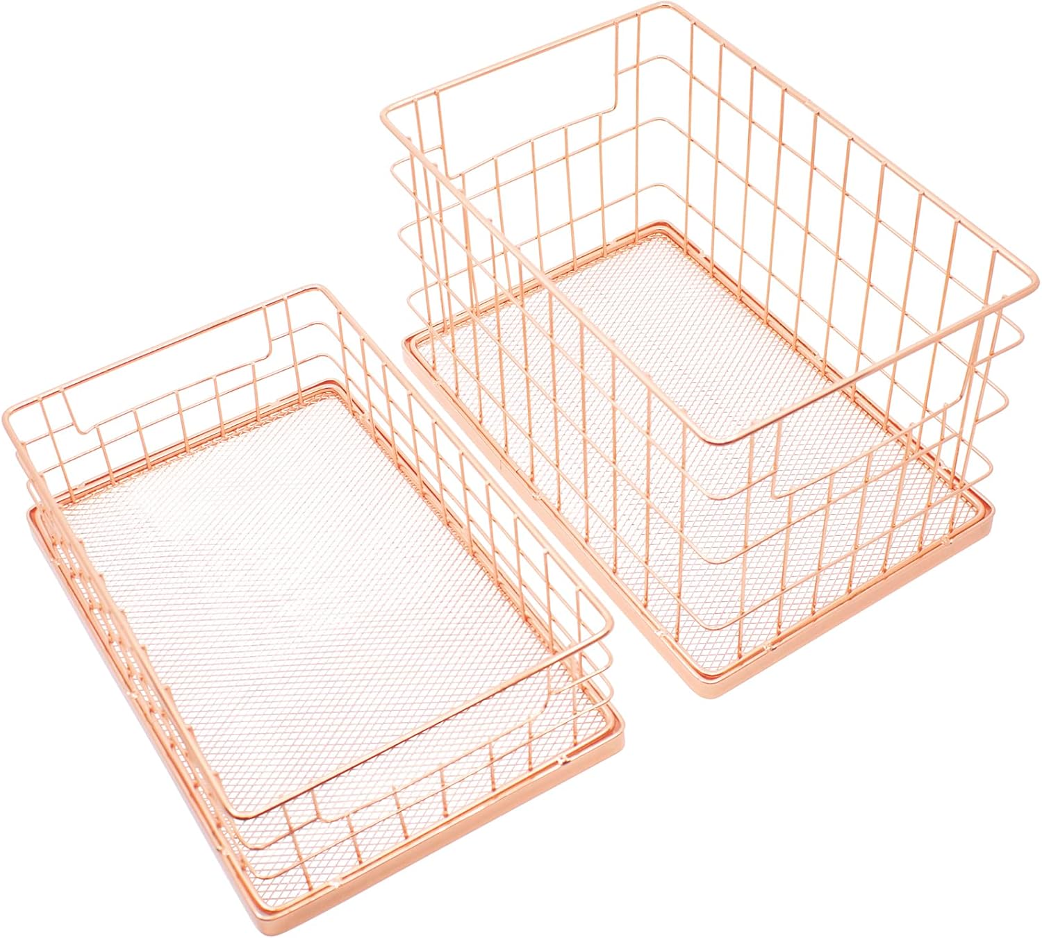 Stylish, sleek and practical: This set of stackable wire baskets is a great solution to home or office organizing!This set of 2 metal wire baskets is a versatile and stylish addition to your home décor. Each set includes two stackable baskets, one large and one small, both made of sturdy metal wire and available in either gold or rose gold finishes with either a wide mesh or woven mesh base.The large basket measures L 10" X W 6.5" X H 6", while the small basket measures L 10" X W 6.5" X H 3". Both baskets have pre-molded handles, making them easy to carry and move around. These baskets are perfect for storing and organizing a variety of items, including books, magazines, towels, toiletries, or any other household items.The stackable design of the baskets makes them easy to store, and they can be placed on top of each other to save space. The wire construction of the baskets provides easy visibility of the contents, making it easy to find what you need quickly.The elegant and modern design of the baskets will complement any décor, whether used in your living room, bedroom, bathroom, or office. Overall, this set of baskets is a practical and stylish solution for organizing your belongings while adding a touch of sophistication to your home décor.Type: Metal Wire BasketsQuantity: 2 unitsColor: Gold (Wide Mesh Base)Size: Large: L 10" X W 6.5" X H 6"; Small: L 10" X W 6.5" X H 3"