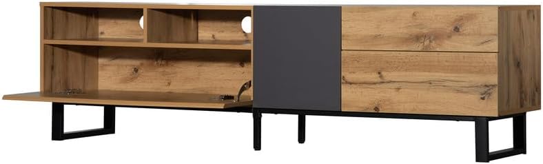 Modern TV Stand for 80" TV with Double Storage Space● Sleek & Contemporary Design – This modern TV stand features a stylish wood and grey finish that complements any living room, bedroom, or home theater. Its clean lines and minimalist aesthetic create a sophisticated entertainment centerpiece.● Spacious Storage & Organization – Designed with double storage spaces, including shelves and a drop-down door compartment, this media console provides ample room for consoles, DVDs, remotes, and other entertainment essentials, keeping your living area tidy and organized.● Durable Construction – Made from high-quality particle board, this TV stand is built to last. Each panel is tested for stability, supporting a TV up to 80" (recommended 70–79" range). The overall structure can support up to 110 lbs, with individual panels holding 88 lbs, shelves 66 lbs, and drawers 33 lbs.● Easy Assembly & Package Contents – Comes with all necessary screws and detailed instructions for a straightforward setup. The package includes the TV stand, screw pack, and assembly instructions for hassle-free installation.● SpecificationsColor: Wood + GreyMaterial: Particle BoardStyle: ModernTV Size Range: 70–79 inches (common 75 inches)Capacity: Overall 110 lbs / Panel 88 lbs / Shelf 66 lbs / Drawer 33 lbsAssembly Required: YesPackage Includes: TV Stand, Screw Pack, Instruction ManualCountry of Origin: China● DimensionsAssembled Size: 70.9" L x 15" W x 19.7" HProduct Weight: 80.5 lbsPackage Size: 41.93" L x 18.31" W x 10.63" HPackage Weight: 88.18 lbs
