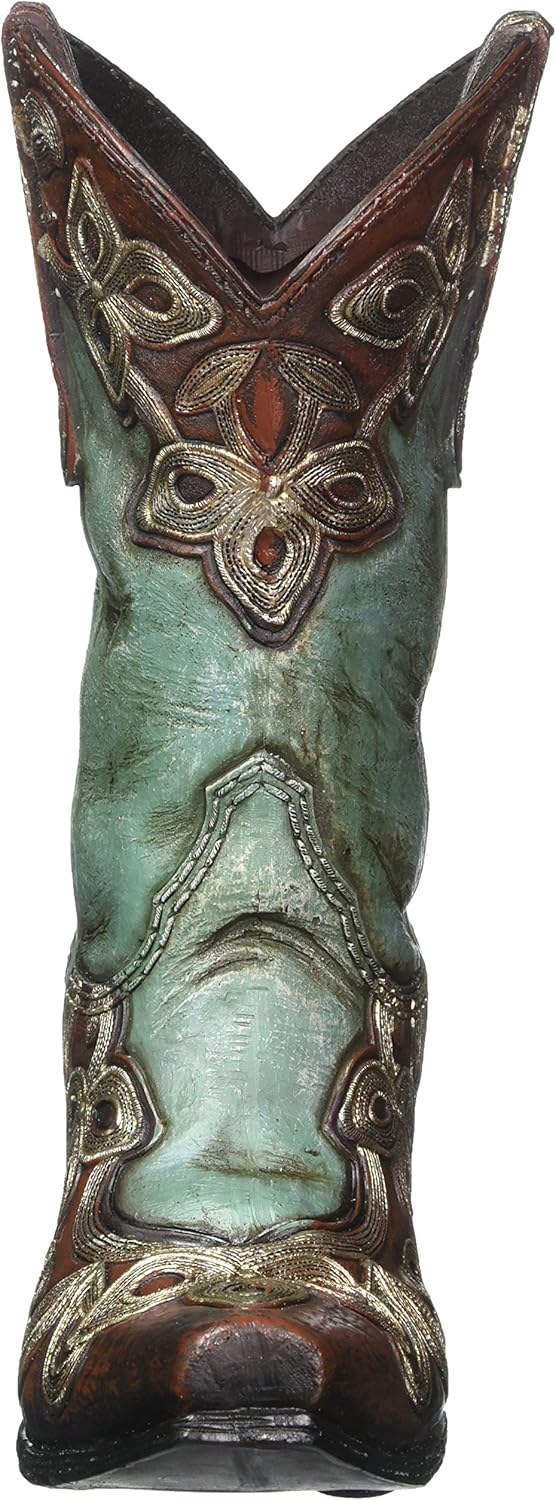 Hand-painted resin with raised elements cowboy boot vase. Turquoise on leg and top of foot portion. Accented with pewter color design on top of brown toe, heel, and opening. Boot has a distressed worn look.9 1/4"H X 3 1/2"W X 7 1/2"DOpening: 2"W X 3"D