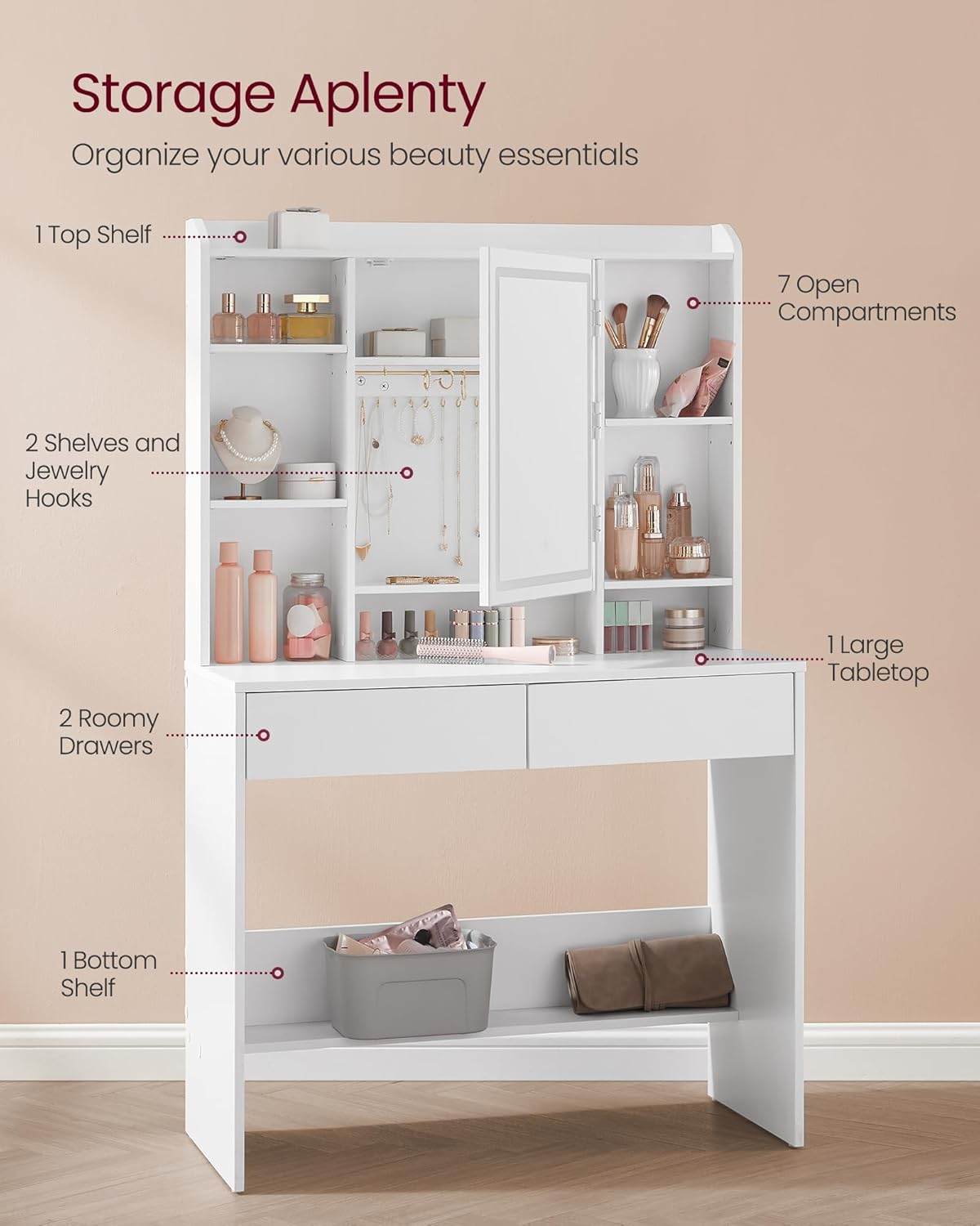 | Included Components | 1 x Accessory Kit, 1 x Anti-Tip Kit, 1 x Instructions, 1 x Vanity Desk with Mirror, 1 x Vanity Stool |