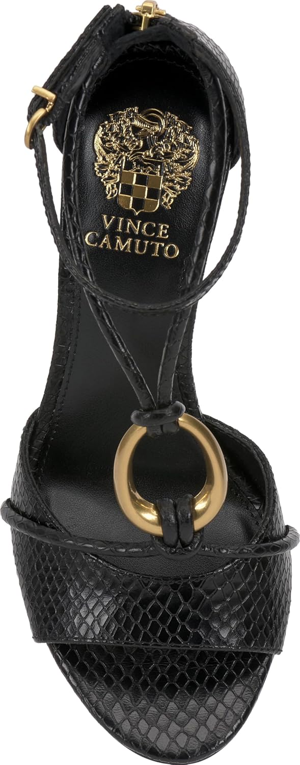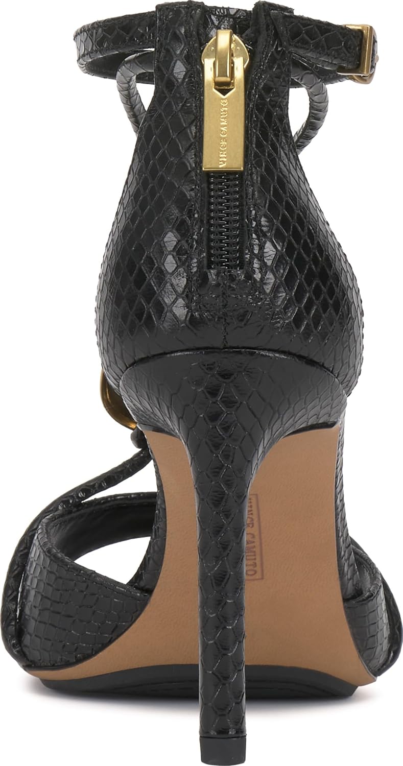 Make a statement with the Alinna heeled sandal. This bold design features an open toe and a closed back with a sleek zipper for easy wear. The adjustable ankle strap ensures a perfect fit, while the tonal covered heel, measuring 3.5 inches, adds just the right amount of lift. This eye-catching sandal has striking gold loop hardware and a practical rubber outsole. Available in daring snake prints-black, gold, and emerald, it's the perfect choice for date night or girls' night out.